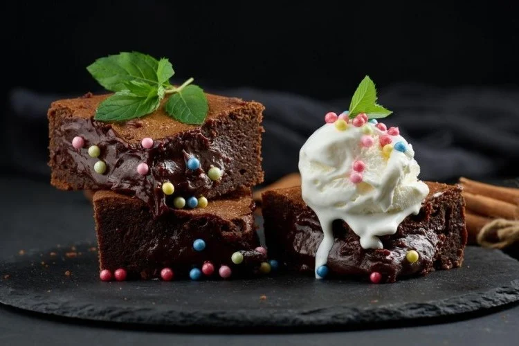ابدئي بتذويب الشوكولاتة الداكنة مع الزبدة على حمام مائي حتى تصبح ناعمة، ثم اتركيها تبرد قليلاً. أضيفي السكر، ثم البيض والفانيليا، واخلطي المكونات جيداً حتى تتجانس. أضيفي الدقيق والكاكاو والملح مع التقليب بلطف حتى تمام التجانس. صبّي نصف كمية خليط البراوني في قالب كيك مبطّن بورق الزبدة.