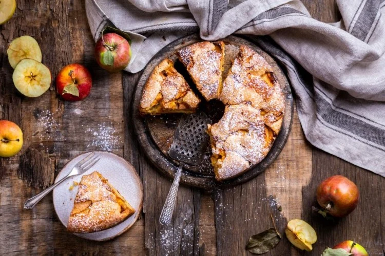 أضيفي نصف كمية التفاح داخل الخليط وقلّبي برفق. في قالب فرن مدهون بالزيت، وزّعي باقي كمية التفاح في القاع ثم اسكبي الخليط. اخبزي الكيكة في فرن بدرجة حرارة 180 مئوية لمدة 35 دقيقة أو حتى تنضج. اتركـي الكيكة تبرد قليلاً ثم قدميها مع رشة من السكر البودرة على الوجه.