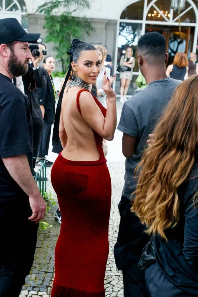 تظهر كيم كارداشيان خلال حضورها في ريو دي جانيرو بإطلالة جريئة تجمع بين الفخامة والجرأة. ترتدي فستاناً أحمر فاتناً من Skims بتصميم يبرز فُتحة رقبة واسعة وصدرية شفافة، وتتناغم معه تنورة ضيقة تصل إلى الأرض وظهر مفتوح يصل حتى الوركين. أكملت الإطلالة بحذاء أسود عالي الكعب وطبقات من القلائد الفضية أضافت لمسة من حس الياقة، فيما رُبط الشعر الداكن إلى الخلف بتسريحة أنيقة وملساء. اعتمدت مكياجاً برونزياً يبرز البشرة المشرقة، حاجبين محدّدين، خدود وردية، وبرونزر بلون الشمس، وتُكمل الشفاه اللامعة باللون الوردي، مع رموش طويلة تبرز بدرجة من اللون الأحمر المائل إلى الرمادي.