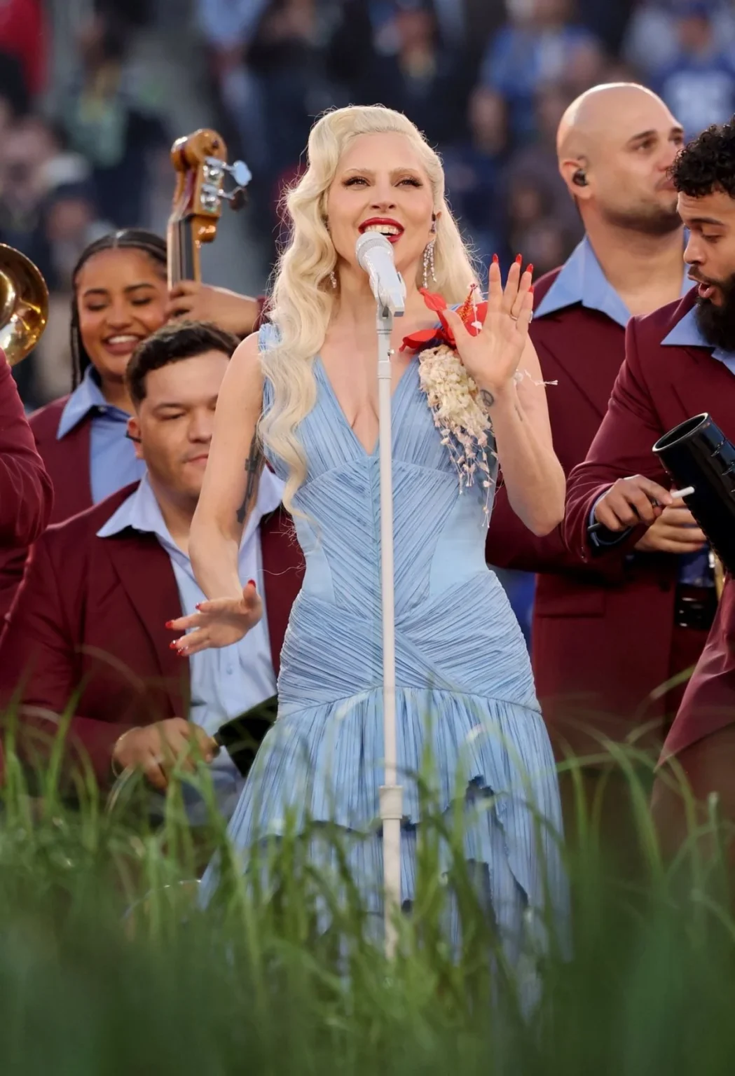 شهد حفل السوبر بول 2026 بنسخته الستين حضوراً لافتاً للنجمات والنجوم ومشاهير الرياضة احتفالاً بإنجازات الموسم. ظهرت ليدي غاغا بفستان أزرق أنيق يجمع بين الكلاسيكية والفخامة، بتصميم بلِيسييه كورسيه ضيق من الأعلى مع حمالات عريضة وفتحة صدر واسعة وجريئة. ينسدل من الأسفل تنورة واسعة تتخللها الكشاكش الناعمة، ما أضفى على الإطلالة بعداً استعراضيًا مناسباً لهذا الحدث.