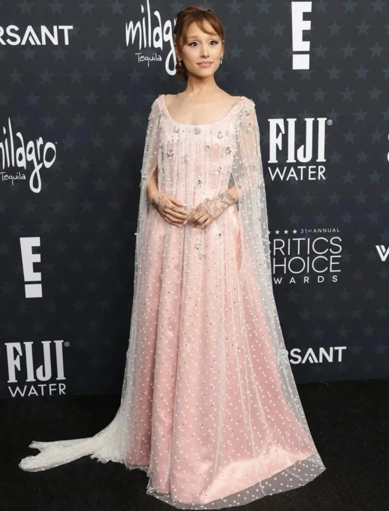 ارتدت أريانا غراندي فستاناً زهرياً باستيلياً من ألبرتا فيريتي، يتميز بقطعة قماش شفافة بيضاء مطرزة بنمط أنثوي وأكمام كاب منسدلة تضيف بعداً درامياً. تحقق التصميم توازنًا بين الرقة والجاذبية المسرحية، مما عكس شخصية الفنانة بشكل ساحر. أكتملت الإطلالة بشعرٍ حريري منسدل وخدود وردية وعيون برتقالية، لتبدو كأيقونة على السجادة.