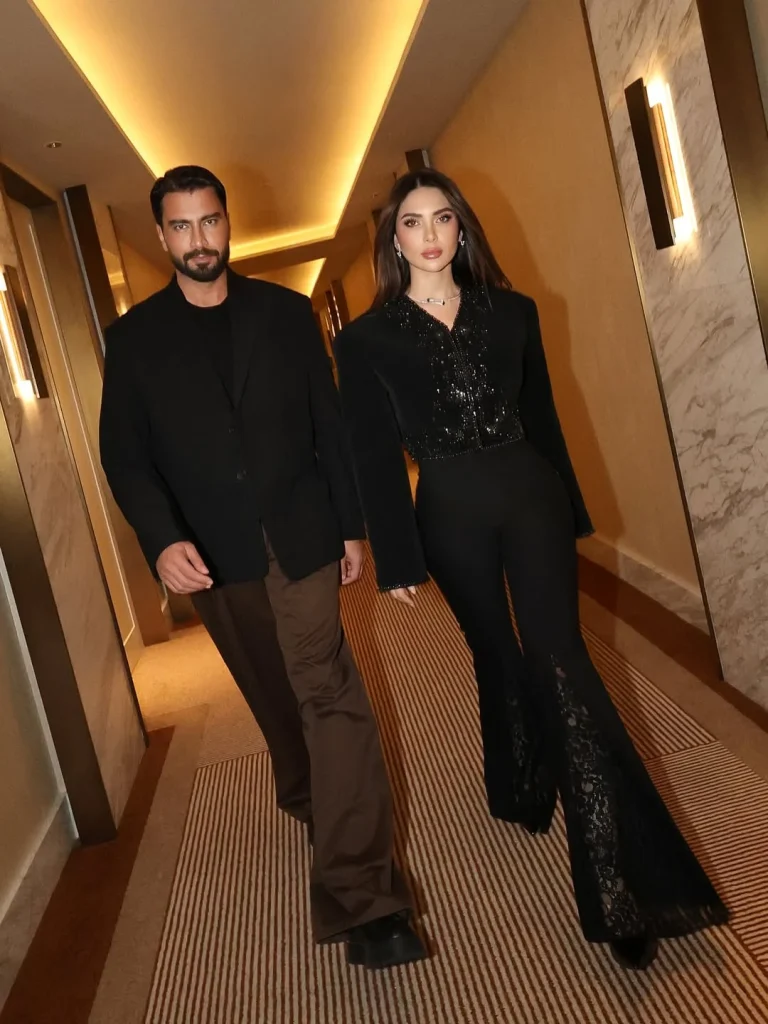اعتمدت لين برنجكجي إطلالة راقية تعكس أسلوبها الهادئ وأناقتها الكلاسيكية. اختارت طقماً أسود فخمًا من توقيع المصمم اللبناني جورج حبيقة، يتكوّن من جاكيت قصيرة مطرّزة وبنطال أسود ضيّق. أضفى التطريز المتقن على الجاكيت بريقاً راقياً وحافظ على هوية اللون الأسود كعنوان للأناقة. تركزت جلسة التصوير على التفاصيل الدقيقة وتوازن المواد لتحقيق حضور مميز.