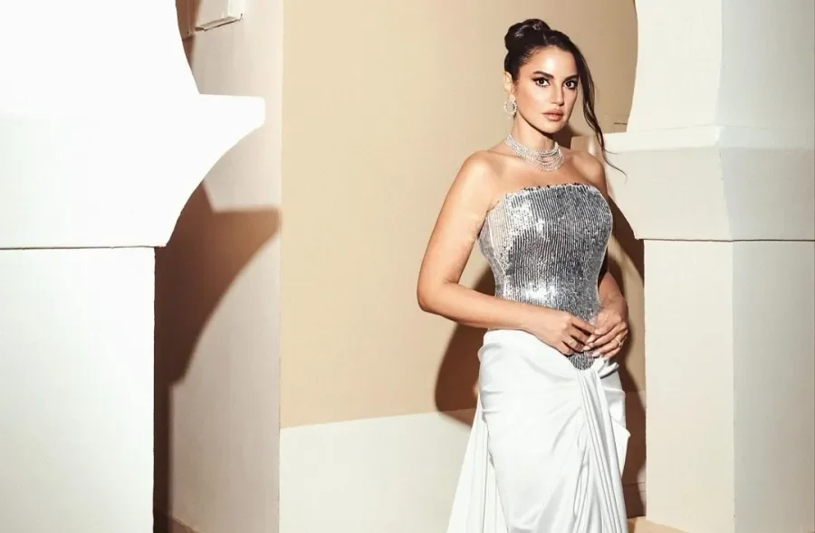 تألقت درة زروق بإطلالة ميتالك تجمع بين الأبيض والفضي بأسلوب يعكس الرقي والهدوء. اختارت فستاناً بقصة كورساج فضية تبرز القسم العلوي وتترك القسم السفلي أبيضاً ليحقق توازناً بصرياً أنيقاً. أكدت تسريحة الشعر المرتفعة وإكسسوارات فضية الأثر على تعزيز اللمعان والأنوثة بشكل متناغم مع لون المعدن.