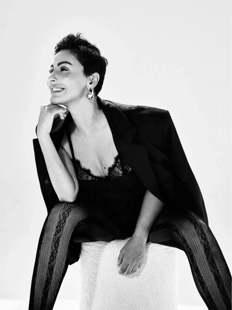اختارت ميس توباً جريئاً من الدانتيل يغطي منطقة الصدر ويمنحها لمسة أنثوية راقية وشفافية مدروسة. نسّقت معه ليغينغ من الشيفون الأسود بتصميم مخرّم وبطابع مقلم أضاف بعداً عصرياً وجاذبية ملحوظة. ولتخفيف حدة الجرأة، أسدلت على كتفيها بليزر أسود كلاسيكي أضفى لمسة رسمية أنيقة وخفّف من حدة الجرأة، ليخلق تناغماً مثالياً بين الأسلوبين.