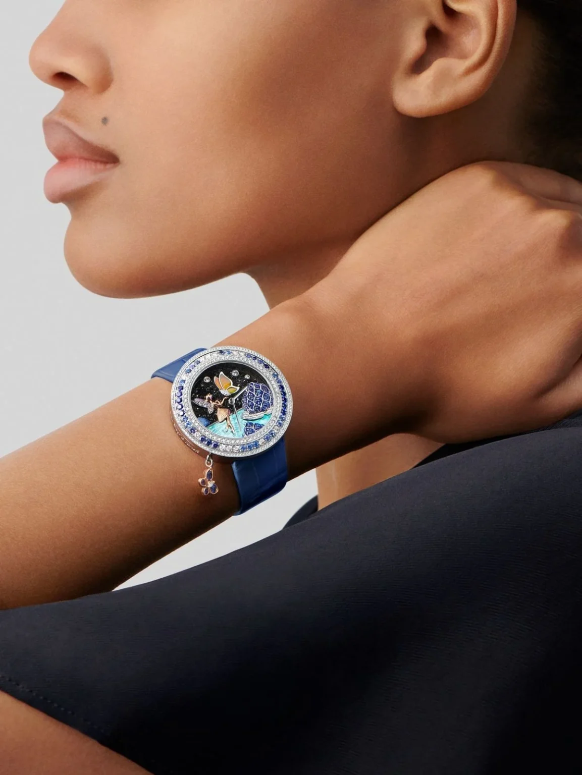 تُبرز ساعة Charms Papillon Féerique من Van Cleef & Arpels حضوراً فريداً على المعصم. تتميز هذه القطعة بتوقيع العلامة وتعبّر عن مستوى عالٍ من الرفاهية والتميّز. تؤكّد هذه الساعة الهوية الفاخرة للعلامة وتكمل الإطلالة بإشراق يلفت الأنظار.