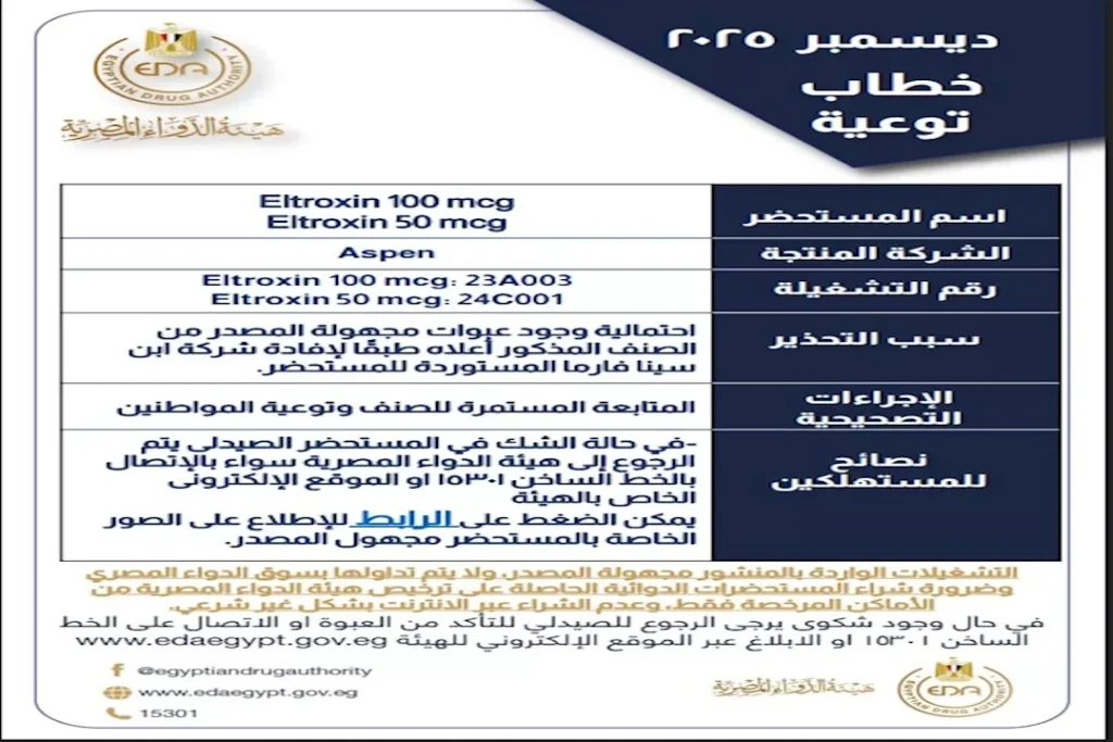 أصدرت هيئة الدواء المصرية تحذيراً عاجلاً للمواطنين والمتخصصين في القطاع الصحي بشأن احتمال تداول عبوات مجهولة المصدر من المستحضر الدوائي Eltroxin بتركيزي 50 ميكروجرام و100 ميكروجرام، والمنتج من شركة Aspen. اعتمدت الهيئة على إفادة رسمية من شركة ابن سينا فارما المستوردة للمستحضر، أكدت وجود عبوات غير معتمدة ومجهولة المصدر في السوق. التشغيلات المعنية هي Eltroxin 100 mcg من التشحيلة 23A003 وEltroxin 50 mcg من التشحيلة 24C001، وتؤكد الهيئة أنها غير مسجلة رسمياً ولا يتم تداولها عبر قنوات سوق الدواء المصري المشروعة.