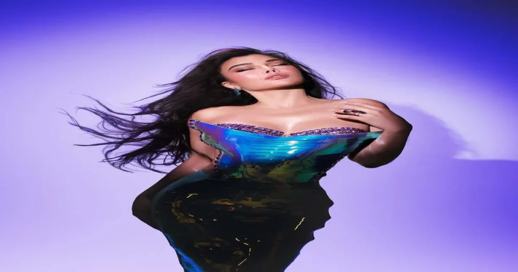 أطلت الفنانة هيفاء وهبي بإطلالة جريئة وعصرية اعتمدت فيها فستانًا منحوتًا يعكس قوامها بشكل واضح. ميز الجزء العلوي بتصميم يحاكي البراليت المطرز بتفاصيل ملونة أضفت لمسة فنية إلى الإطلالة. انتقل التصميم بسلاسة إلى كورسيه منحوت بقصة سترابلس مع لمسة معدنية وتداخل درجات لونية متناغمة بين الأزرق والفضي والبنفسجي. أما القصة السفلية فكانت ضيقة، ما عزز من أناقة التصميم وأبرز رشاقة القوام بأسلوب راق وجريء.