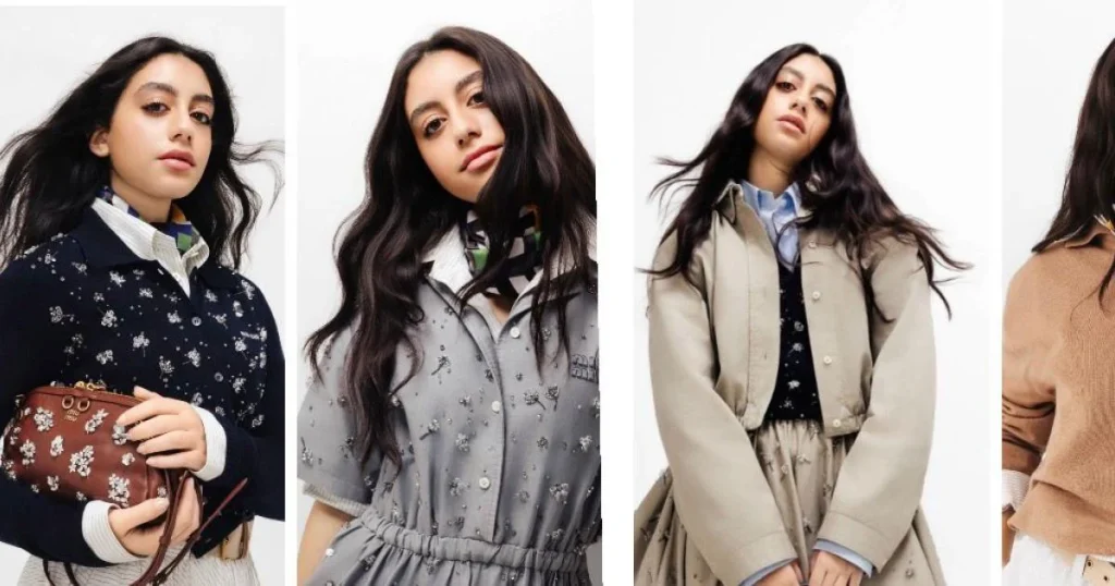 وفي إطلالة أخرى، جمعت ياسمينا بين الأناقة والراحة باختيار قميص أزرق مقلم مع بلوزة مطرزة وتنسيق مع تنورة A-Line واسعة مطرزة، وأكملت المظهر بجاكيت بومبر بنفس لون التنورة المحايدة. هذه التوليفة تعكس قدرة ياسمينا على دمج القطع بأسلوب حديث ومريح. التقطت الصورة على يد المصوّرة Lucie Sassiat.