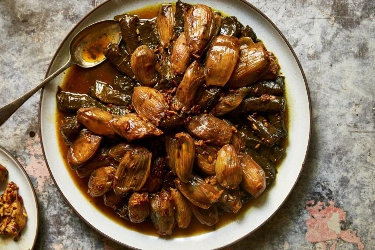 يلف الشيف ورق العنب المحشو بإحكام على شكل أسطوانة.