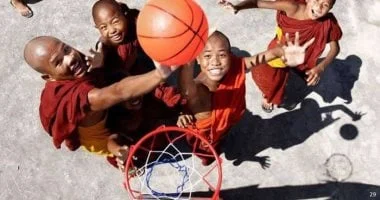 تظهر إحدى الصور رهبانًا صغارًا غارقين في الصلاة بوجوه هادئة ومركزة وأردية تتلألأ تحت ضوء ناعم. وفي صورة أخرى يتحول هذا السكون إلى حركة عفوية لأطفال حفاة يلعبون كرة القدم أو كرة السلة في ساحات الأديرة وهم يضحكون بلا قيود. وتوثّق لقطات أخرى لحظات يقوم فيها الرهبان بتمارين وصفاء الطقوس، ما يؤكد أن الدعاء واللعب ينسجان سويًا كجزء من نموهم.