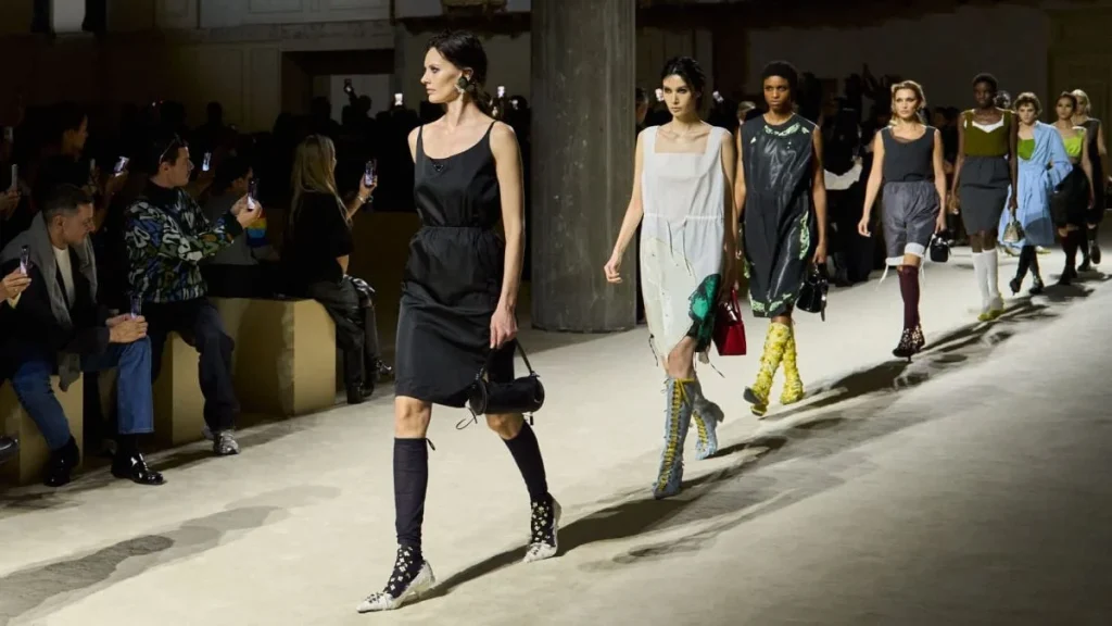 تتبدّل المنظورات عبر تحويل أنواع الملابس وخلطها بشكل غير هرمي. تُرتدى الملابس بتراكم دقيق يجمع بين التفاصيل الرفيعة والقطع الرياضية وفساتين الساتان المطرزة وتراكيب متناقضة تعكس لغة برادا المميزة في الموضة. تثير الشظايا والانكسارات فضولاً وتلمّح التحولات الداخلية إلى ما قد يظهر فوق السطح.